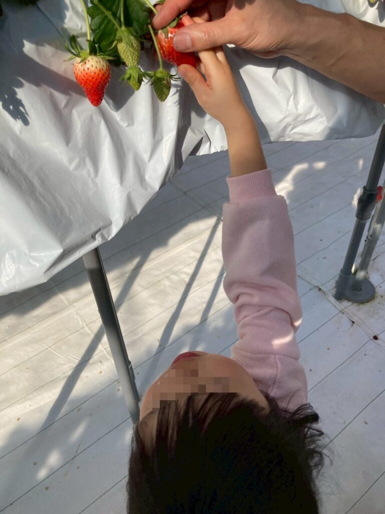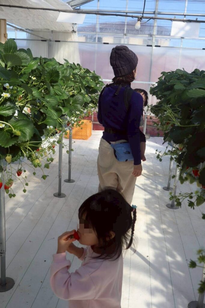 3歳は品種の味の違いまでは分からなそうでしたけど、「おいしいおいしい♡」とパパよりたくさん食べていましたし、赤いいちごを見つけるのも楽しそうでした。3歳(100センチ)だと届いたり届かなかったりくらいの高さです。でも親が取ってあげないと、いちごを根本から引き抜きそうなので、取ってあげていました。