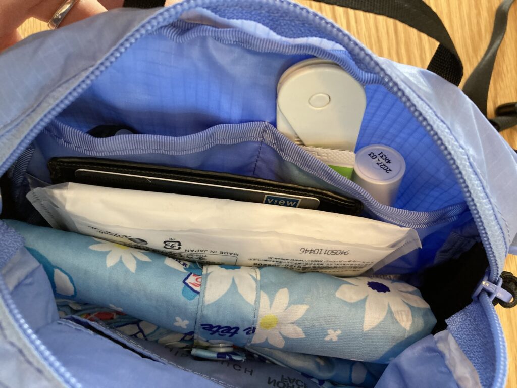 一つのバックで出かけたい時も、これだけ小さいと、気軽にポケッタブル仕様にして、念の為に入れておくこともできます。突然子供と遊具で遊ぶことになったり(うちではあるある)、そんな時サッと貴重品だけ身につけられて便利でした。もちろん、旅行の時なんかにバッグに入れておくのもおすすめです。散策や買い出しにちょっと動きたい時に使えると思います。