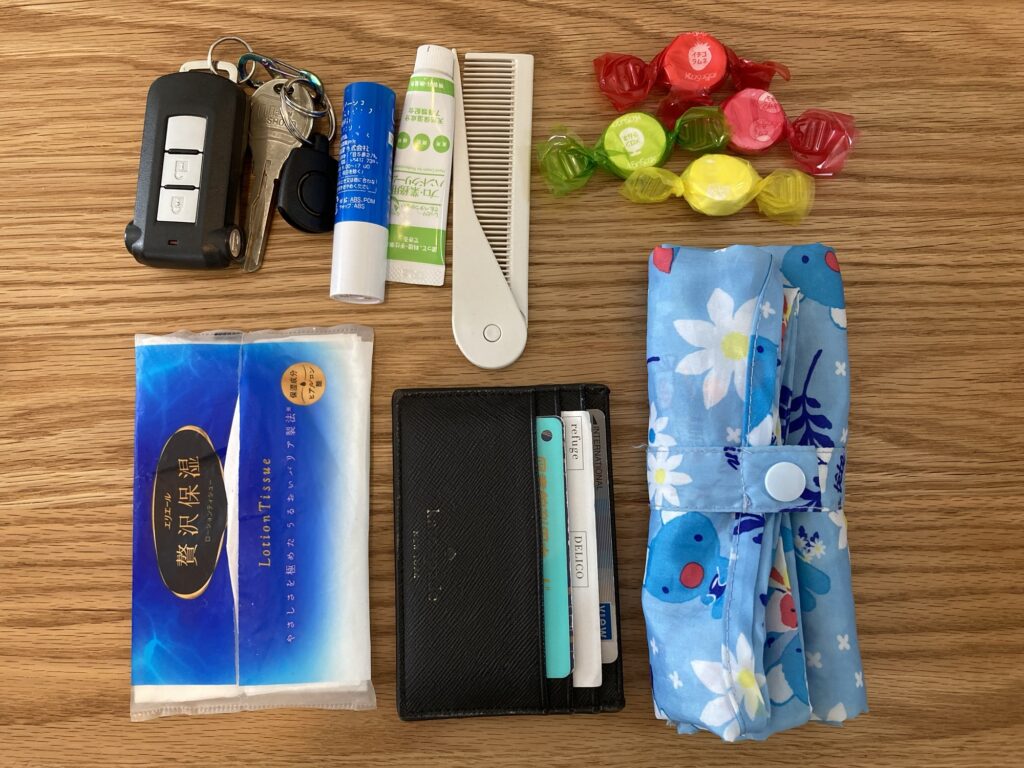 スマホ、家と車の鍵、カードケース(クレジットカード・免許)、小銭入れ、エコバッグ、リップクリーム、ハンドクリーム、くし、ちょっとしたお菓子