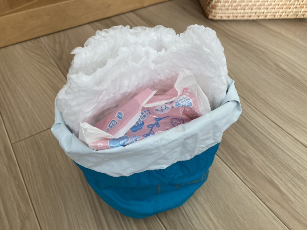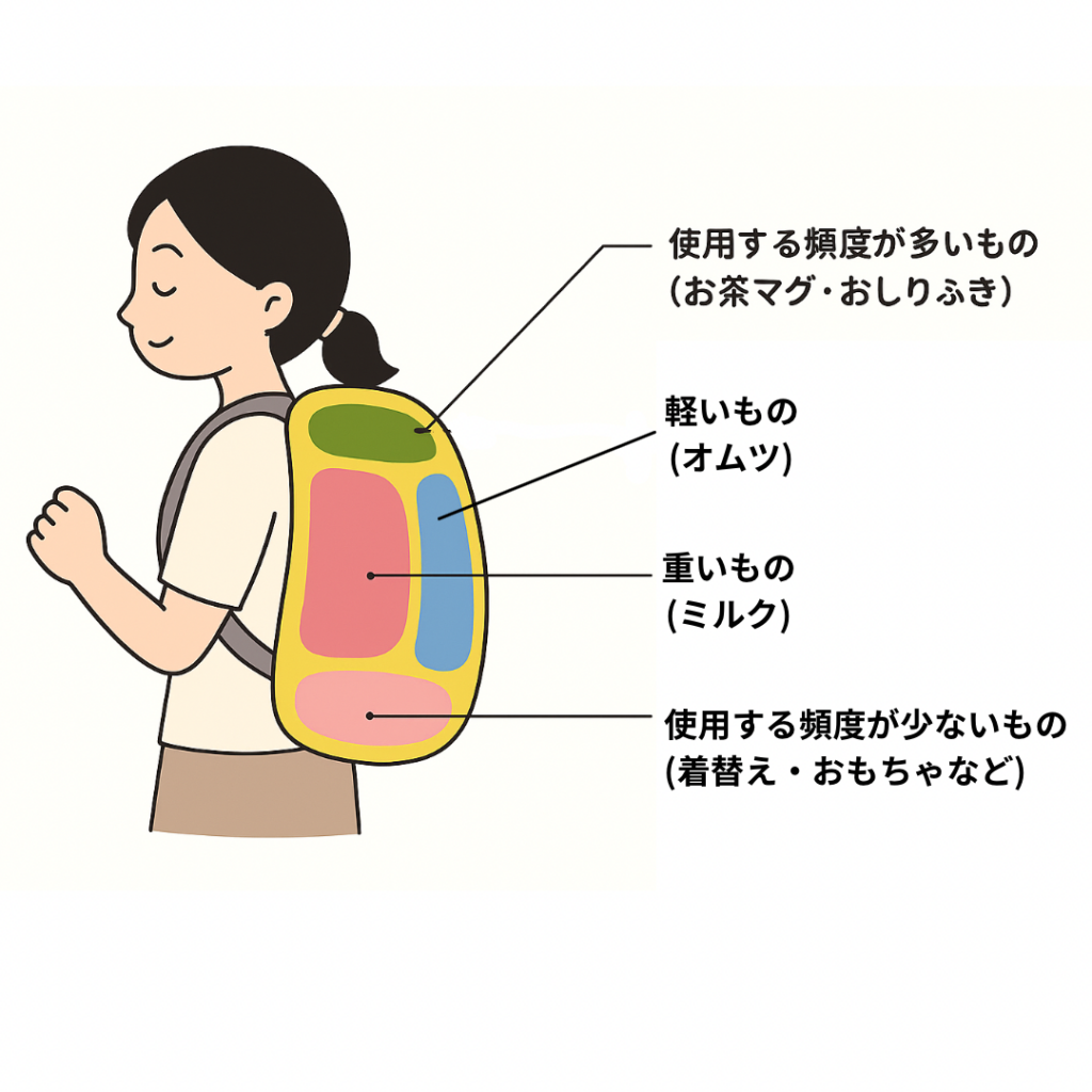 私はおしりふきも意外と重いので、オムツと別に最上段、おもちゃは一つはすぐ出せるようにサイドポケットに、など工夫していました。