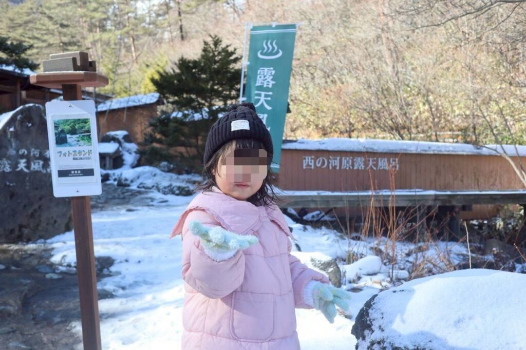 西の河原温泉に入りたいという旦那さんの希望があったんですが、大変すぎるので私と0歳は温泉街で待機3歳と旦那は雪の中めげずに入りに行きました。