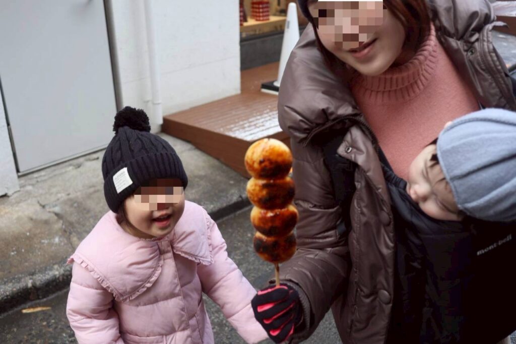 途中から雪も降ってきて、軽く吹雪いてもいたので、中々ゆっくり回れる状態ではなく、食べ歩きもそこそこにしました。焼きまんじゅうと、温泉まんじゅう、串焼きみたいなのを食べました。温泉まんじゅうは3歳も温かくて美味しそうでした。